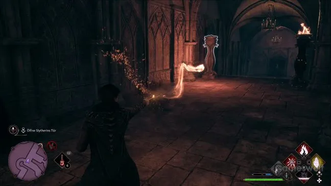 После встречи с товарищами выясняется, что один из вас должен применить пыточное проклятие Крутио. Оптимальный вариант - вы добровольно становитесь жертвой, а Себастьян исполняет проклятие. В результате откроется дверь в потайную комнату, где вы найдете книгу Слитрина. Она будет важна для выполнения следующих заданий. Кроме того, теперь вы можете сами управлять Круцио. Не забудьте использовать Revelio, потому что здесь также есть скрытая страница руководства.