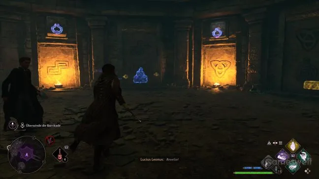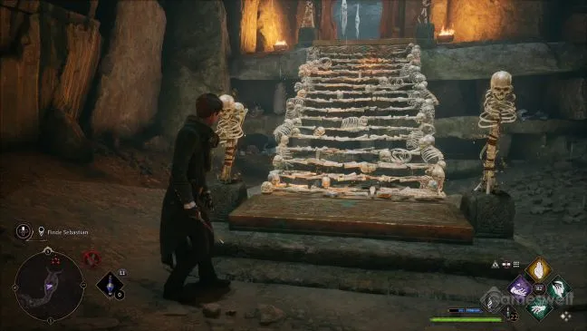 Прежде всего, вы попадете к алтарю со старым скелетом. За ним находится странный заваленный проход. Вам нужно разложить кости алтаря вокруг арки прохода, используя Wingardium Leviosa. Однако одного набора костей недостаточно. Откройте соседние отсеки с помощью Accio, чтобы найти еще один набор костей. Третий набор костей можно найти в соседней комнате, если взорвать блокирующую дверь с помощью Depulso. Если вы разложили достаточно костей вокруг двери, она откроется.