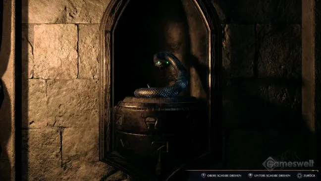 В левой части коридора Вы найдете еще одни ворота, нижняя половина которых отсутствует. Прокатитесь под ними и зажгите факел на стене, чтобы не приходилось постоянно светить самому. Прямо рядом с факелом Вы найдете странный слизеринский замок в виде змеи, спящей на двух цилиндрических дисках. Поверните диски так, чтобы перед ними были видны два символа, которые Вы только что запомнили. После этого откроются соответствующие ворота.