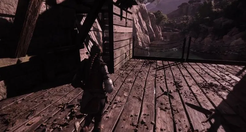 Теперь в вашем распоряжении новый путь, по которому вы идете назад к реке и по каменному полу налево. Идите к лежащим на земле бревнам и возьмите сундук справа от вас и пирит, прилипший к камню. Поверните налево, пока не увидите тележку, полную камней. Войдите в нишу справа и протиснитесь через щель в деревянном заборе. За ним вы найдете лестницу, по которой можно подняться на крышу здания. Это приведет вас к верстаку, который можно открыть только с помощью ножа.