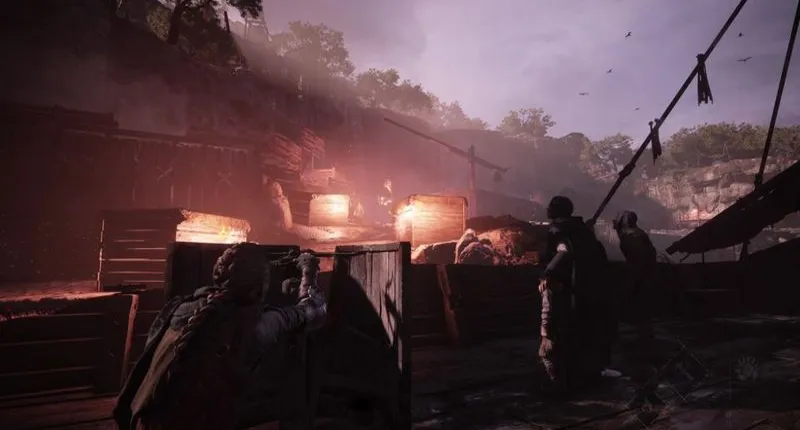 Далее следует погоня, в которой вы автоматически пересекаете реку на лодке и расстреливаете из арбалета как можно больше солдат. Вы также столкнетесь с препятствием в виде мусора, который вы подожжете с помощью болта с игнифером. Вы сразу же пересечете овраг, где на вас нападет еще больше солдат. Обращайте особое внимание на широкие платформы, на которых копошатся несколько противников: На них стоит несколько банок со смолой, которые вы должны поджечь для собственной защиты.