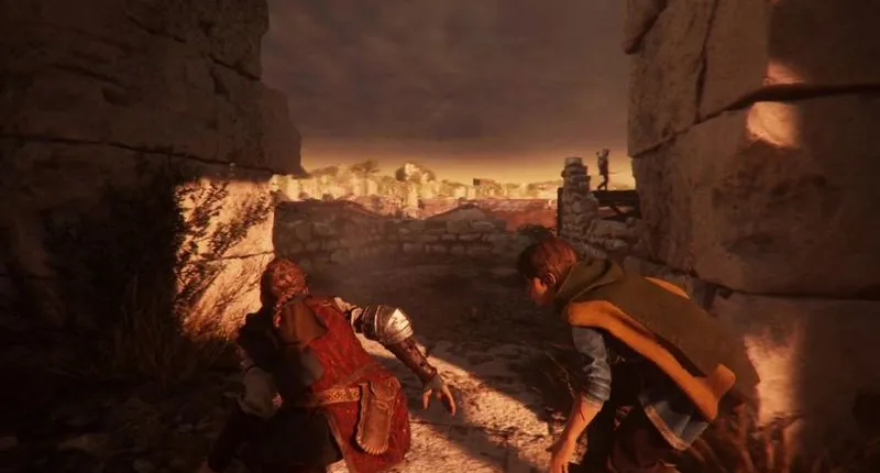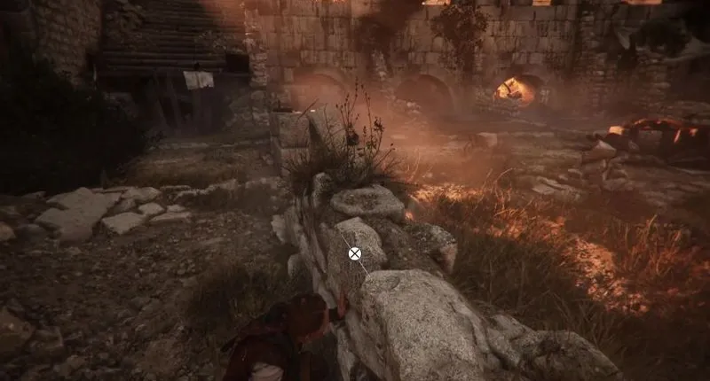 Теперь вы должны стоять перед остатками стены, которые вы можете немедленно использовать в качестве укрытия. Следите за патрулирующим охранником перед вами, а также за лучником, стоящим на деревянной конструкции с крюком сзади слева. Когда оба отвернутся от вас, пробирайтесь влево к неглубокому арочному проходу, который в основном завален камнями. Вы можете протиснуться через щель и сразу же прикарманить деньги слева от вас.