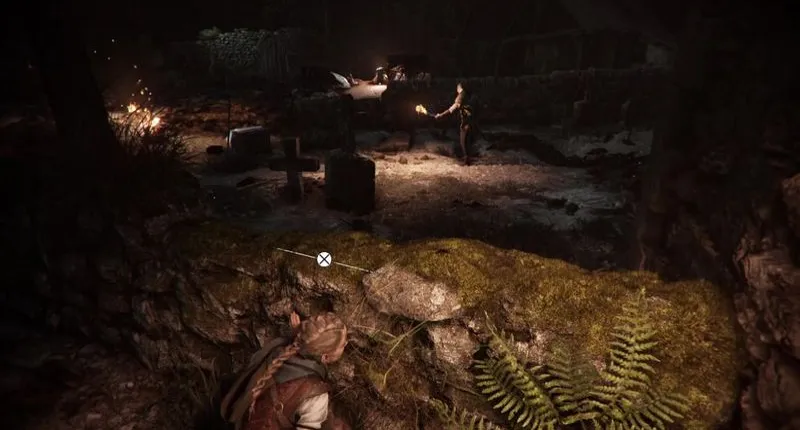 Пока вы видите перед собой несколько крыс, вы можете укрыться за куском стены справа от вас. Посмотрите, как одинокий солдат осматривает вырытую могилу. Немедленно бросьте селитру в его факел, чтобы он погас и крысы упали на него. Далее перелезьте через стену и проберитесь налево к следующей чаше с огнем и ящику.