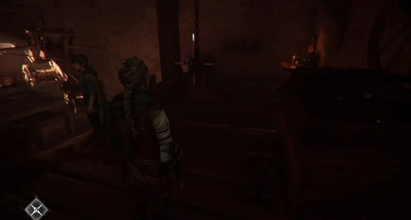 Нужно как-то застать злодеев врасплох, поэтому вы смотрите на тележку, свисающую с потолка. Он крепится с помощью цепочки, которую нужно как-то ослабить. Однако вы не можете прицелиться в крюк снизу, и вам придется найти более выгодную позицию.