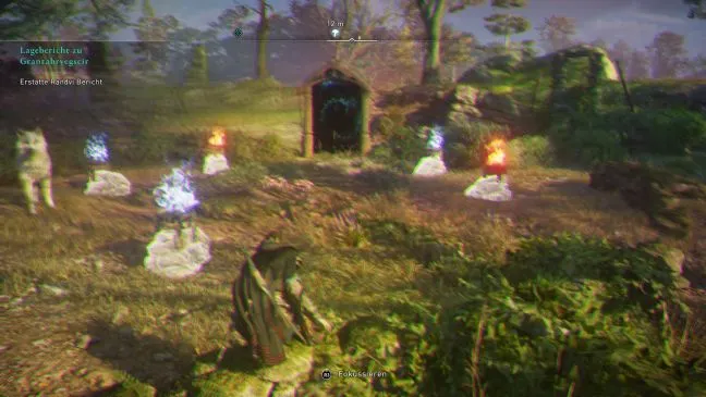 Гриб № 14: В лесу к востоку от города Глоукейстер, к северо-западу от друидской хижины, вы найдете еще один жабник, раздавите его, и в воздухе появятся статуи с огненными чашами. Теперь ваша задача - выпустить стрелу во все огненные чаши, на статуе которых изображено знамя Равенклана. Огонь становится синим, и как только вы поймаете их все, путь к мистическим воротам будет свободен.