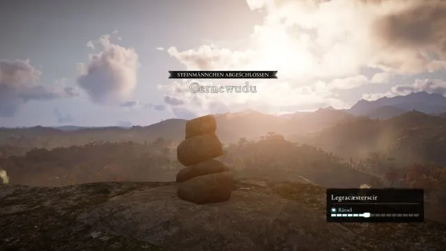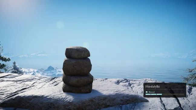 Каирн № 1 (Хёрдафилки): Этот каирн расположен на острове средних размеров к западу от резиденции короля Харальда, Альрексстадира. Вы можете посетить это место при первом посещении Хёрдафёльки. Место находится в горах, к юго-западу от смотровой площадки. Пообщайтесь с валунами. Теперь сложите их в стопку, как показано на нашем рисунке, и проверьте конструкцию. Вы получите награду и сможете двигаться дальше.