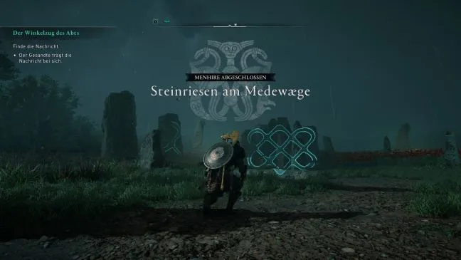 Каменные гиганты в Медевеге: Это скопление камней расположено к востоку от монастыря Тонебридж и к северу от деревни Бимасфилд, недалеко от реки Медевейдж. Как обычно, взаимодействуйте с оставленным посланием, а затем используйте зрение Одина. Чтобы найти знак, встаньте немного восточнее и посмотрите в сторону скал. Немного поднапрягитесь, и знак появится, а вы решите эту головоломку.