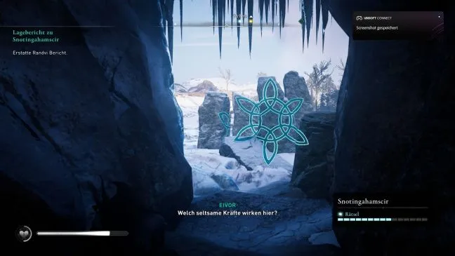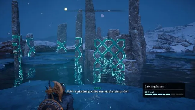 Камни Эскфорда: К востоку от Станбурха и к северу от заставы Манейс находятся камни Эскфорда. Принцип действия ясен: прочитайте послание на маленьком камне и запомните символ, который теперь нужно воспроизвести. Отметьте взглядом Одина искомые части символа и обойдите описанные каменные плиты справа и монолиты за ними, чтобы разрушить ледяную поверхность на другой стороне. Вернитесь к каменной плите и с нее перепрыгните на соседнюю платформу слева. Здесь теперь можно сформировать символ, как показано на рисунке.