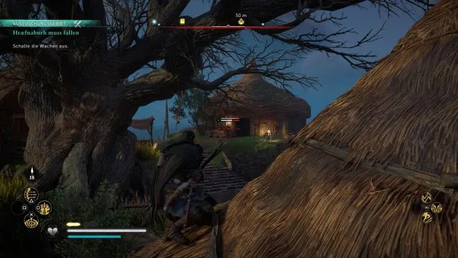 Держитесь левой стороны и бегите, приседая, через высокую траву, чтобы остаться незамеченным. Уничтожайте врагов либо с помощью покушения сзади, либо, если вы уверены в своей цели, из лука и стрел.