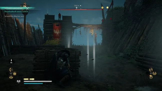Существует альтернативный путь на крайнем северо-западе комплекса. Там часть укрепления отсутствует, и можно проскользнуть через дыру и, если не опасаться расставленных лучников, довольно легко пробраться к церкви. В любом случае нужно добраться до следующей стены и незаметно перепрыгнуть на другую сторону по деревянным платформам.