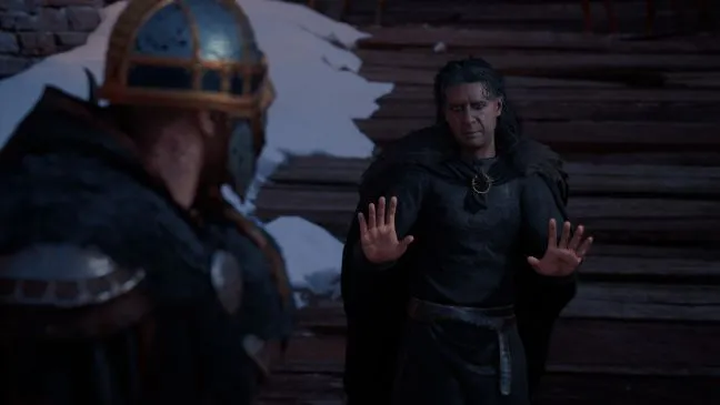 После разговора отправляйтесь на север города, в приход. Снова используйте зрение Одина, чтобы заметить места, которые нужно исследовать Эйвору. В дом слева можно войти, отодвинув препятствие сзади и выстрелив в засов на входной двери через окно за ней. В доме справа, где живет искомый священник, на крыше есть навес из веток, который можно разрушить. Используйте его, чтобы получить доступ и получить ответы на вопросы.