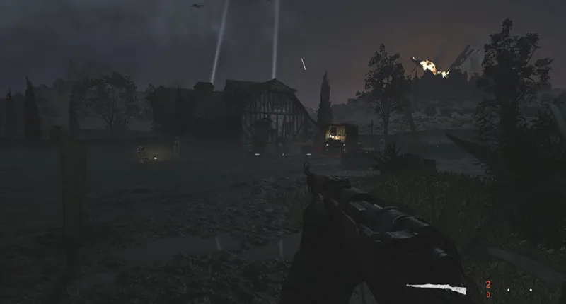 Держитесь правой стороны и будьте осторожны, чтобы вас не заметили нацисты на дороге, которые ищут выживших с факелами. Как только вы приблизитесь к товарищу по команде, он будет убит. Вы не сможете предотвратить его гибель, поэтому даже не пытайтесь, а подкрадитесь к врагу, как только он захочет разграбить мертвого солдата. Убейте его и сразу же застрелите второго врага, как только сможете использовать винтовку.