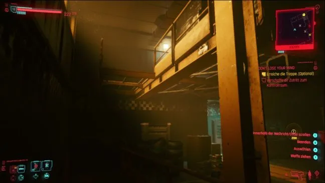 Теперь Вы находитесь в узком проходе и должны увидеть лестницу с одной стороны. Вам нужно подняться по ней и снова идти по пешеходному мосту, пока не окажетесь перед пропастью. Прежде чем перепрыгнуть на другую сторону, позаботьтесь об особенно агрессивном дроне, летящем в Вашу сторону.