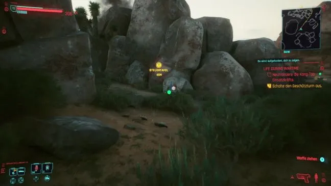 На этом месте вас ожидают четыре робота Канг Тао и дрон, которых лучше уничтожить. Поскольку они находятся посреди открытого поля, а вокруг них достаточно камней для укрытия, их следует уничтожать из снайперской винтовки. Если у Вас нет под рукой снайперской винтовки, то сначала пройдите по широкой дуге и обойдите справа на северо-запад от места крушения. Там, среди больших камней, вы найдете некомату, которая вполне подойдет для ваших целей.