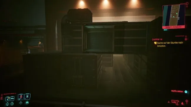 Поскольку предотвратить это невозможно, советуем применить другую тактику: заберитесь на контейнер слева и перейдите к открытому, который должен быть виден сверху (см. рисунок). Пересекайте его, пока не увидите вдалеке яркий свет. За светом вы увидите лестницу, еще больше ящиков и, прежде всего, стрелка. Теперь Вы можете удобно выстрелить в него из винтовки со своей текущей позиции и таким образом вызвать открытый бой.