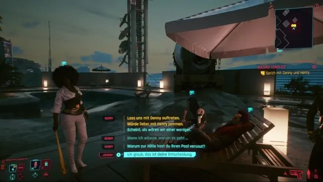 Далее следует продолжительный разговор с Керри, во время которого Вы следуете за ним и в промежутках просматриваете старую запись. Как только вы вернете себе контроль над V, вам придется позвонить Нэнси Хартли. К сожалению, ее нет дома, поэтому приходится довольствоваться ее раздраженным помощником Стивеном. После этого миссия заканчивается и начинается Второй конфликт.