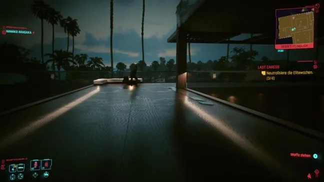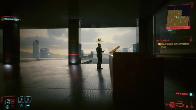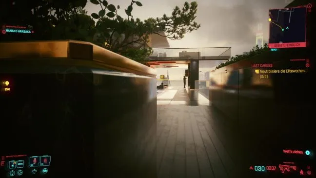Через некоторое время вы попадете на узкую лестницу, по которой не следует подниматься. Вместо этого поднимитесь по плоским камням справа и укройтесь за первыми ящиками с надписью Arasaka. Теперь нужно быть очень терпеливым и внимательно следить за противниками: