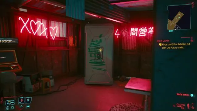 Сразу же отправляйтесь в трущобы на окраине Кабуки и обшаривайте одно здание за другим. Ваша цель - большой контейнер с надписью "Без будущего". Первая подсказка: контейнер стоит вертикально. Вторая подсказка: надпись сделана вдоль и поперек и имеет бирюзовый цвет. Третья подсказка: контейнер находится в здании на востоке от трущоб и недалеко от воды.