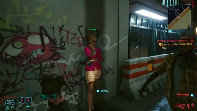 Далее следует довольно скучная погоня, в которой сначала нужно найти рабочее место жены Пепе. Для этого просто выйдите из бара и идите по широкой улице направо. Приближайтесь к целевому маркеру до тех пор, пока он не сменится на целевую зону по данным радара. В этой зоне Вы должны искать женщину и менять сторону улицы. Вы также пройдете мимо двери с надписью "Exit" и вскоре наткнетесь на жену Пепе по имени Синтия, которую вы узнаете по розовой кофточке.