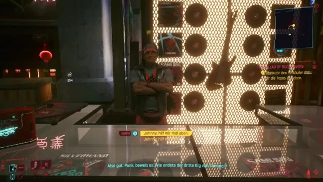 Вход в клуб находится в нескольких метрах к юго-западу и оказывается азиатским рестораном. Вы попросите у хозяина кассеты с записями самураев, и он направит вас к торговцу пластинками по имени Карим, у которого также есть киоск на рынке. Если у вас уже есть майка Джонни (см. побочное задание "Ленточный червь") и вы ее носите, он спросит вас о ней.
