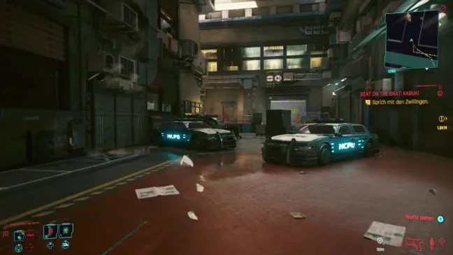 Непосредственно перед городским садом вы увидите справа широкую нишу, в которой должно стоять несколько машин NCPD. Если это не так, то вы либо еще не играли в игру Playing for Time, либо, к сожалению, запустили миссию в более ранний момент и не выполнили ее правильно.