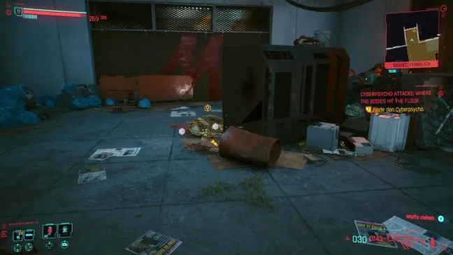 За грузовиком стоит синий контейнер, а между ними на земле видны пятна крови. Они приведут вас к нескольким зданиям, между которыми находится киберпсихолог Эралио Альма. Точнее, он сидит в мехе, с помощью которого он может нанести большой урон.