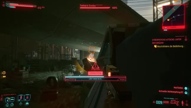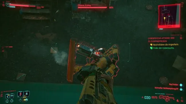 Поэтому заберитесь на бочки рядом с дверью, а оттуда - на крышу здания. Теперь вы можете прицелиться в Чейза сверху и выстрелить в него. Он, конечно, заметит вас и использует красную лопату своего мехи в качестве щита. Если у вас есть Quickhack Short Circuit, вы можете уничтожить лопату с его помощью. В противном случае вам придется регулярно уходить из зоны видимости и заставать его врасплох из-за другого угла.