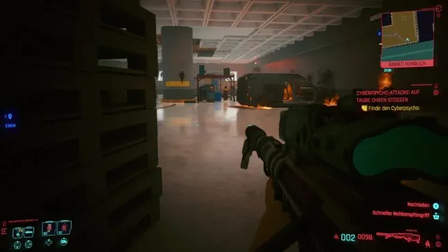 Для выполнения следующего киберпсихологического задания необходимо зайти в гараж и спуститься по пандусам на уровень А. Там Вы найдете несколько бело-красных баррикад, а за ними - несколько горящих обломков автомобилей. Там вы обнаружите несколько бело-красных баррикад и несколько горящих обломков автомобилей, за которыми прячется псих Седрик Мюллер. Вы сможете прицелиться в него с расстояния из снайперской винтовки и выстрелить ему один раз в голову.