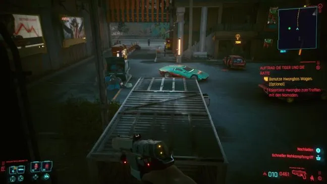 Пройдите мимо комнат и найдите щель в перилах. Под ним должен находиться контейнер, в который можно спрыгнуть и использовать в качестве укрытия. Если перед Вами находится враг, подождите, пока он не отойдет. В противном случае проберитесь прямо к барьеру и пройдите мимо охранника справа, чтобы попасть к машине Хванбо.