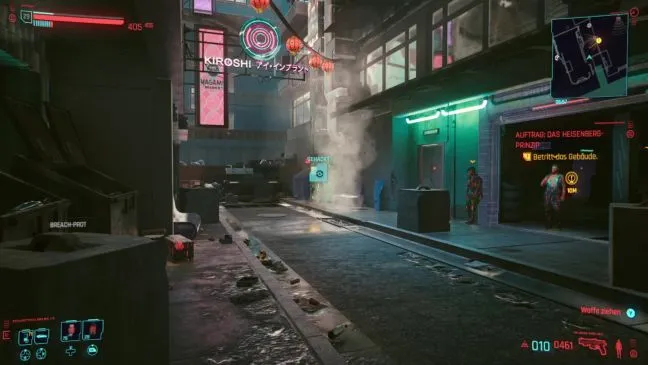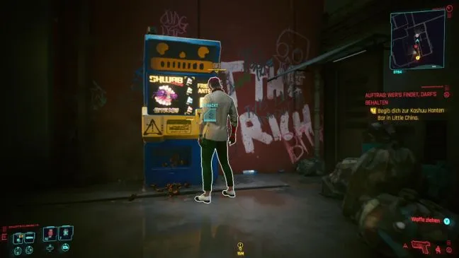 Ваш пункт назначения - бар "Кашуу Хантен" в Маленьком Китае, куда можно попасть, как правило, спереди. Однако имплантат, который вы ищете, находится в одной из задних комнат, которая, разумеется, охраняется. Поэтому выйдите из бара и исследуйте узкий боковой переулок. Там тоже есть охранник, но его можно отвлечь с помощью синего спонтанного автомата для удовлетворения потребностей.