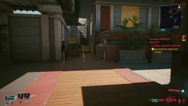 Поскольку по дороге справа вы столкнетесь с несколькими охранниками, лучше пройти прямо в здание и направиться к ящикам слева. Внимание: за ними находится дверь, над которой висит камера!
