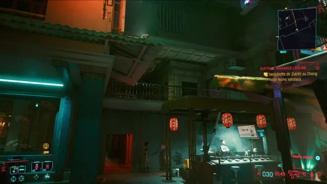 Просто подойдите к отмеченному зданию и найдите на юго-восточной стороне киоск с едой. Вы можете забраться на их матерчатые крыши и сразу же перепрыгнуть на соседнюю веранду. Там пройдите прямо и откройте дверь слева в самом конце.