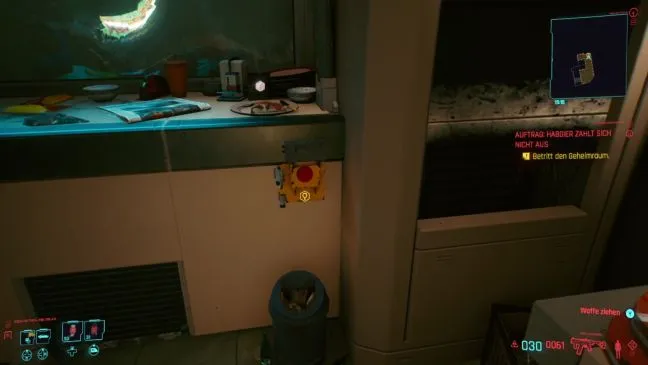 Независимо от того, как вы попали наверх, подойдите к отмеченной двери квартиры и наберите на клавиатуре код 2137, который вы получили вместе с описанием задания. Теперь тщательно осмотритесь внутри квартиры и обратите особое внимание на толстый торговый автомат: Просканировав его, вы обнаружите за ним потайную комнату. Но как войти в нее или отодвинуть автомат?