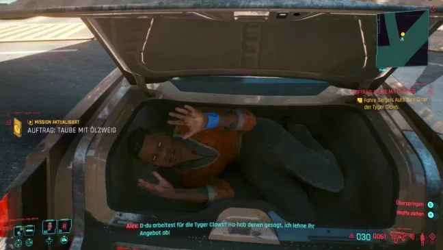 На полпути вы вдруг услышали шум из багажника. В любом случае следует выйти и посмотреть: Вы действительно обнаружите человека по имени Алекс, которого Вы собираетесь доставить в "Когти Тигра". Он делает вам предложение и хочет заплатить вдвое больше, если вы его отпустите.