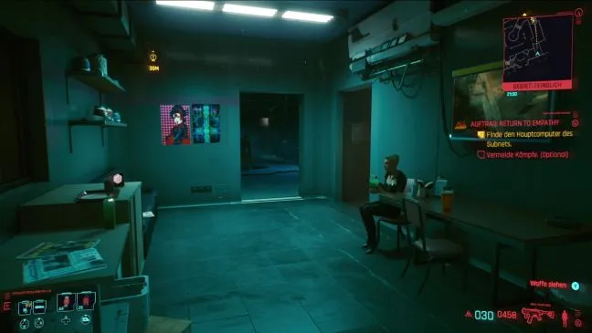 Женщина сидит прямо за Вами на диване и не замечает Вас благодаря активному BrainDance. Вы можете отобрать у нее игрушки и попытаться договориться с ней, но это ловушка: даже если вы будете милы и сговорчивы, она в конце концов предаст вас и позовет охрану. Поэтому лучше всего задушить ее сзади.