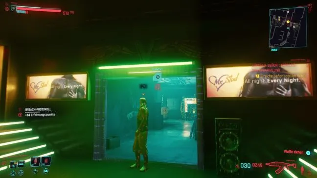 Сразу же отправляйтесь на танцпол и найдите справа охраняемый проход, освещенный синим светом. Стоящего там охранника можно легко отвлечь, взломав висящую за ним камеру. Воспользуйтесь этой возможностью, чтобы деактивировать ее, а затем задушить охранника сзади.