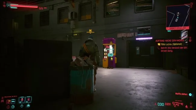 Непосредственно перед входом в убежище находится еще один охранник, которого можно отвлечь с помощью стоящего рядом автомата для удовлетворения спонтанных потребностей. Кроме того, в углу справа от входа и этажом выше висит камера, которую вы взломаете, чтобы убедиться в этом.