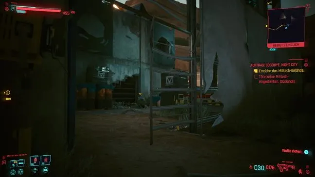 К сожалению, покинуть зону прямым путем не удастся, так как лестница не достает до земли, и подняться обратно не получится. Но это не так страшно, ведь достаточно открыть двери справа и снова оказаться в синей комнате. Здесь нужно обойти крытую площадку слева и обратить внимание на охранников справа. В конце концов вы дойдете до синего контейнера, вокруг которого нужно пройти налево и таким образом окончательно покинуть зону.