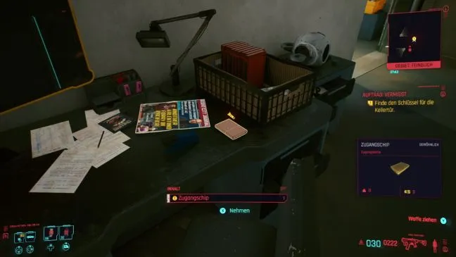 Осмотрите хорошо обставленную комнату и изучите стол, на котором, помимо прочего, стоит компьютер и лежит газета. Среди всех этих вещей вы обнаружите чип доступа, с помощью которого можно открыть синюю дверь, открытую ранее. Это приведет вас к Бену, и все, что вам нужно сделать, - это вывести его из гаража. Для этого выйдите прямо на улицу и пройдите налево мимо отключенной пушки, чтобы вернуться к автомобилю.