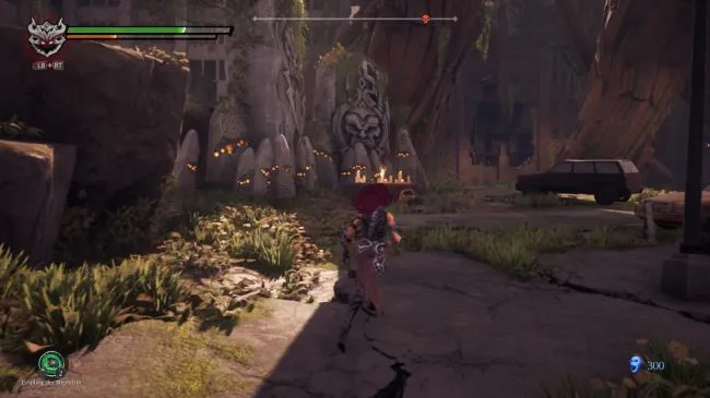 Далее на восток вы обнаружите каменный столб с лицом и алтарь, на котором лежит фрагмент силы. Слева от каменного столба можно подняться в широкий тупик. Сразу же обратите внимание на фасад сгнившей башни, к которой прилепилось каменное существо. Оно нападет на вас, как только вы приблизитесь к нему.