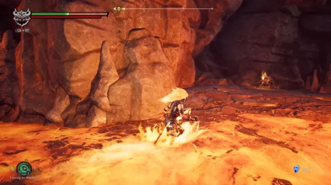 У подножия лестницы возьмите небольшую кучку лурчеров, лежащую в юго-восточном углу. Затем пройдите дальше на запад направо, и вы увидите издалека несколько узких арок с перекладинами. Непосредственно перед ними можно спрыгнуть в лаву справа и взять с края демонический артефакт. Поднимитесь обратно и перекатитесь на запад на платформу с колючкой и небольшим лечебным фрагментом.