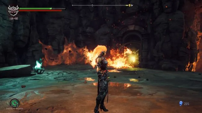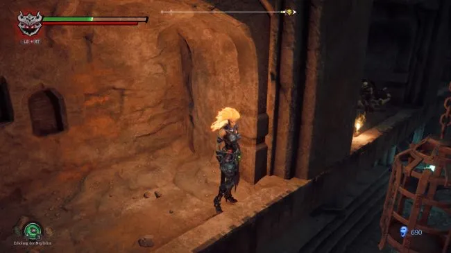 На другой стороне открытого моста уничтожьте вазу на перекрестке, чтобы получить Фрагмент гнева. Пробивайтесь дальше вправо, пока не попадете в большую комнату с лестницей. Она граничит со следующими каменными воротами, которые так просто не открыть. Для этого вам понадобятся два меча, которые нужно активировать - но в данный момент вы видите только один справа от ворот, а тот, что слева, отсутствует.