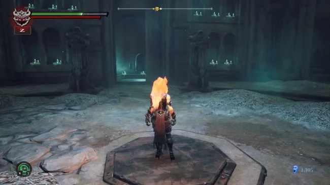 За мечом вы увидите решетчатые ворота, над которыми висит рельефный меч. Как и раньше, нужно прыгнуть на него с помощью способности "Пламя", чтобы активировать ее и открыть ворота. За ними вы вернетесь в зал и окажетесь в центре.