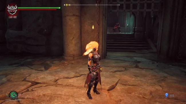 Если же подняться по лестнице до самого верха, то можно попасть на другой перекресток. Слева от него находится небольшая смотровая площадка, с которой можно увидеть зал сверху. Продолжайте идти прямо, и вы снова спуститесь к нескольким скелетам, некоторые из которых бронированы. Поэтому вы не сможете броситься на них с дикой силой и будете вынуждены время от времени уклоняться и отражать их атаки.