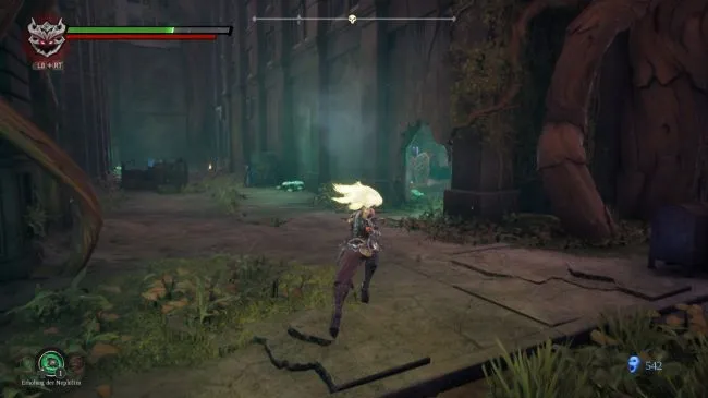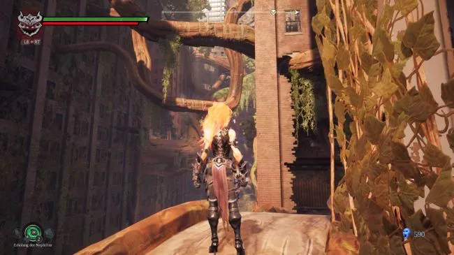 Не спрыгивайте пока на улицу, а пройдите несколько шагов назад, пока не окажетесь на углу здания. Снова повернитесь и посмотрите вверх, где висят еще два корня. Благодаря способности "Пламя" и колючкам вы сможете перепрыгнуть на небольшую платформу, прикрепленную к зданию слева. На ней вас ждут несколько светящихся останков.