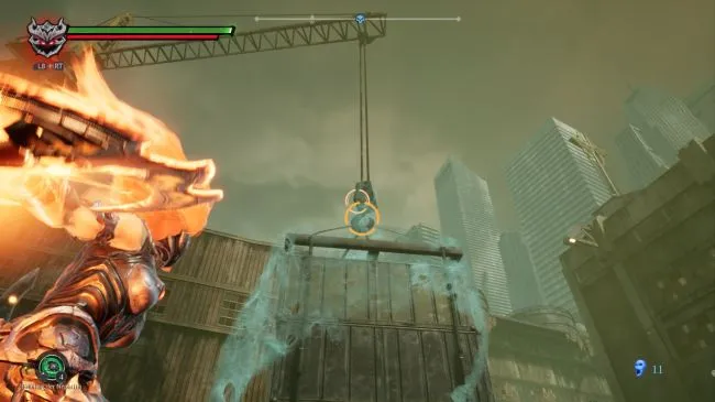 Кроме виселицы и плоской металлической платформы, вы наверняка заметили висящий в воздухе контейнер, обмотанный паутиной. Вы не можете достать его ни мечом, ни прыжками, но можете достать его с помощью нового выкупающего оружия. К счастью, вы можете связать его со всеми своими способностями, удерживая кнопку броска.