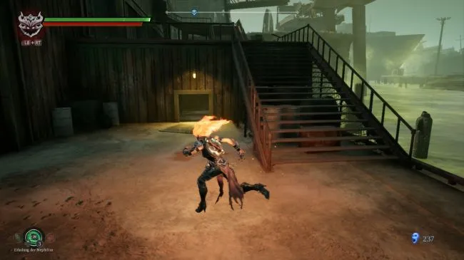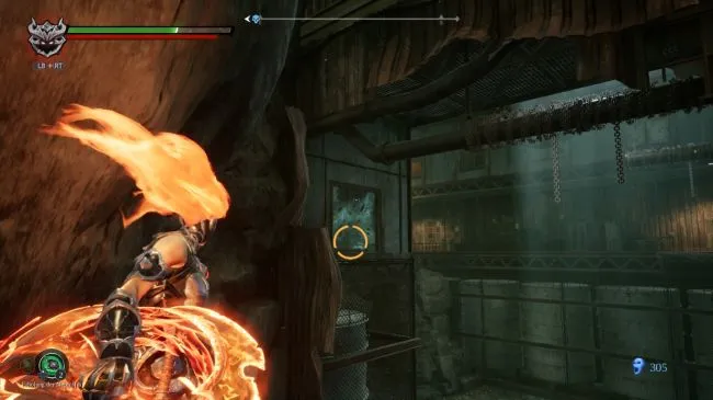 Справа от вас появится контейнер, перепрыгните через него и попадете к демону. Рядом с ним лежит фрагмент шипа, а лестница на краю приведет Вас к демону с бирюзовыми крыльями. После боя над вами окажется полуразрушенная платформа, на которую вы сможете забраться благодаря способности "Пламя" и таким образом добраться до артефакта демона.