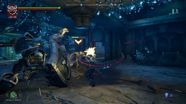 Ведь скелет выполняет большинство своих атак по отдельности и редко в виде сложных комбинаций ударов. Поэтому можно смело контратаковать после каждой атаки. Кроме того, во время боя следует активировать силовую способность и использовать заряженные удары. Они стоят несколько секунд времени на подготовку, но зато пробивают щит противника и отталкивают его от себя. Последнее автоматически гарантирует, что его контратака не пройдет.