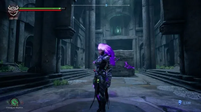 Разбив большого скелета, вы получите фрагмент исцеления с одной из колонн в комнате, а перед входной дверью лежит небольшой комок лурчера. На восточной стороне вы найдете дыру в стене, за которой нужно разбить фиолетовый камень, открыв еще одно отверстие в полу. Оно приведет вас в подводный проход с враждебными угрями и щупальцевыми демонами.