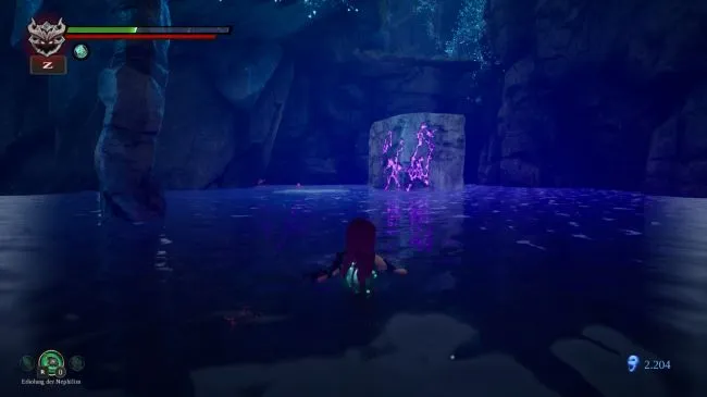 Проплыв несколько метров, Вы попадете к почти вертикально воткнутому в землю обломку поезда, за которым находится большая куча лурчеров. Поскольку больше ничего важного здесь не видно, подплывите к обломкам и найдите два фиолетовых каменных блока. Прежде чем разобраться с ними, найдите светящееся голубым отверстие в скале на востоке. Оно приведет вас к нетленному фрагменту и синей светящейся битве.